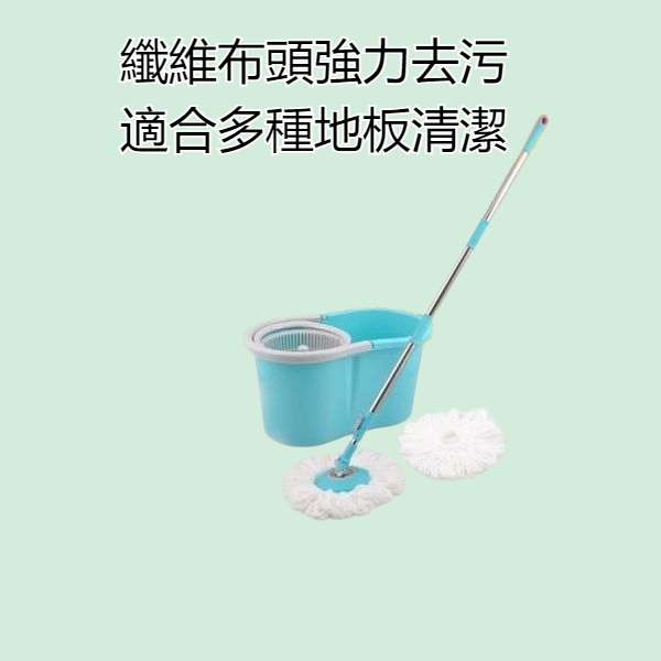 家用百貨大全旋轉拖把,免手洗設計,塑膠材質堅固耐用,不鏽鋼桿防鏽抗蝕,纖維布頭強力去污,適合多種地板清潔。